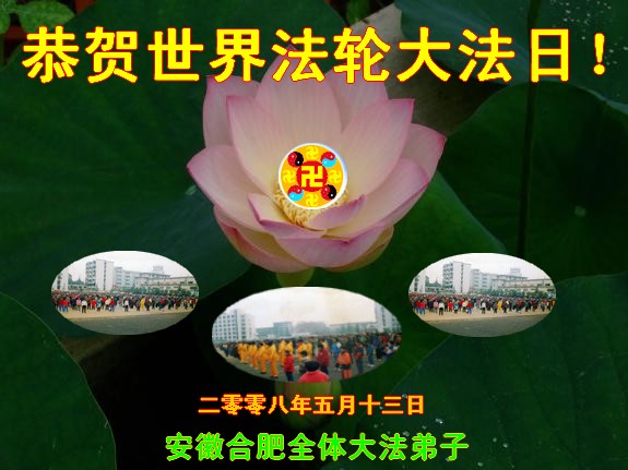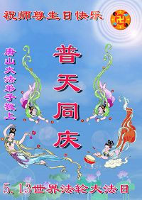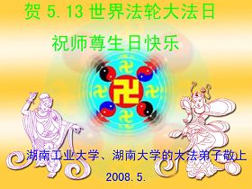 师尊华诞,普天同庆同贺。 弟子跪祝师尊好。唯以修好自己、做好三件事以报师恩。 海南大法弟子 2008年5月7日 湖北应城市全体大法弟子敬谢师恩!恭祝慈悲伟大的师尊生日快乐!恭贺世界法轮大法日!