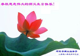 师尊好,祝师父生日快乐! 您的弟子们遵照师父的教诲,不断学法,遇事向内找,正念正行,精進不停,坚持做好三件事,讲清真相,救度不同行业、不同层次的迷中众生。兑现我们的誓约,完成我们的史前大愿,圆满随师还。 河北省会石家庄:民航、文化、公安、气象、商业、司法、水利、医学等系统全体大法弟子,合十。 2008年5月6日 河北保定九旬老弟子携全家人恭祝师父生日快乐!