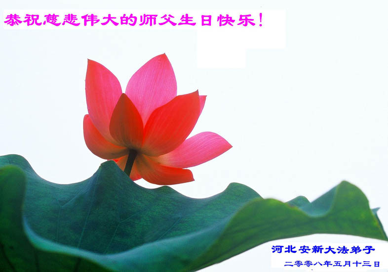 在这殊胜的日子里,邯郸全体大法弟子向师尊表示:一定要做好三件事,在救度众生的同时修好自己,时时事事向内找,正信、正念、正行,圆容好大法,圆容好整体,达到整体提高,整体升华,让师尊多一份欣慰,少一份操劳。 二零零八年五月七日 兰州市永登县中川镇大法弟子敬祝慈悲伟大的师尊生日快乐