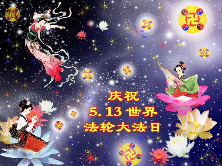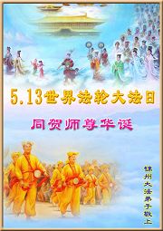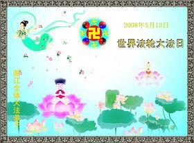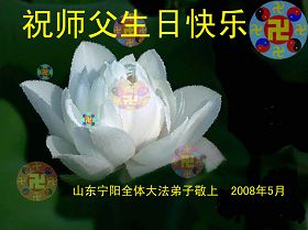 庆祝5.13日世界法轮大法日! 庆贺法轮大法洪传十六周年! 请师尊放心,作为一个整体,我们一定会互相配合好,共同精進,走好最后的路。兑现史前的誓约! 二零零八年五月九日 敬贺 山东章丘大法弟子祝师尊生日快乐!