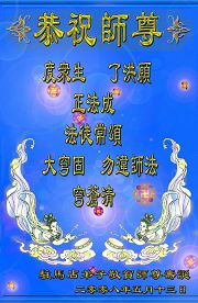 | 【明慧网二零零八年五月十二日】 安徽合肥大法弟子恭贺慈悲伟大的师尊生日快乐! 河北安新大法弟子恭贺慈悲伟大的师尊生日快乐! 上海大法弟子恭贺慈悲伟大的师尊生日快乐! 安徽阜阳大法弟子恭贺慈悲伟大的师尊生日快乐! 广州增城大法弟子恭贺慈悲伟大的师尊生日快乐! 沈阳大法弟子恭贺慈悲伟大的师尊生日快乐! 锦州大法弟子恭贺慈悲伟大的师尊生日快乐! 郑州大法弟子恭贺慈悲伟大的师尊生日快乐! 安徽全体大法弟子恭贺慈悲伟大的师尊生日快乐! 河南驻马店大法弟子恭贺慈悲伟大的师尊生日快乐! 郑州大法小弟子恭贺慈悲伟大的师尊生日快乐! 宝清县大法弟子恭贺慈悲伟大的师尊生日快乐! 唐山大法弟子恭贺慈悲伟大的师尊生日快乐! 山东东平大法弟子恭贺慈悲伟大的师尊生日快乐! 山东肥城大法弟子恭贺慈悲伟大的师尊生日快乐! 沈阳大法弟子恭贺慈悲伟大的师尊生日快乐! 山东复员军人大法弟子恭贺慈悲伟大的师尊生日快乐! 广州天河区大法弟子恭贺慈悲伟大的师尊生日快乐! 本溪大法弟子恭贺慈悲伟大的师尊生日快乐! 大连电力系统大法弟子恭贺慈悲伟大的师尊生日快乐! 湖南工业大学、湖南大学大法弟子恭贺慈悲伟大的师尊生日快乐! 莱钢大法弟子恭贺慈悲伟大的师尊生日快乐! 莱钢流离失所的大法弟子恭贺慈悲伟大的师尊生日快乐! 牡丹江大法弟子恭贺慈悲伟大的师尊生日快乐! 中国农业发展银行大法弟子恭贺慈悲伟大的师尊生日快乐! 山东宁阳大法弟子恭贺慈悲伟大的师尊生日快乐! 山东泗水大法弟子恭贺慈悲伟大的师尊生日快乐! 广州大法弟子恭贺慈悲伟大的师尊生日快乐! 广州大法小弟子恭贺慈悲伟大的师尊生日快乐! 黑龙江省木兰县大法弟子恭贺慈悲伟大的师尊生日快乐! 临清大法弟子恭贺慈悲伟大的师尊生日快乐! 哈尔滨市大法弟子恭贺慈悲伟大的师尊生日快乐! 大陆大法弟子恭贺慈悲伟大的师尊生日快乐! 廊坊大法弟子祝师尊生日快乐 哈尔滨大法弟子祝师父生日快乐! 邯郸市全体大法弟子恭祝师尊生日快乐! 江苏连云港市全体大法弟子恭祝师尊生日快乐! 唐山市全体大法弟子恭祝师尊生日快乐! 辽宁大法弟子恭祝师尊生日快乐! 河南省焦作市大法弟子恭祝慈悲伟大的师父生日快乐! 辽宁熊岳大法弟子恭祝师尊生日快乐! 黑龙江省安达市大法弟子祝师尊生日快乐! 辽宁省民航系统全体大法弟子恭贺师尊生日快乐! 浙江全体大法弟子祝师尊生日快乐 宁夏被非法关押的大法弟子祝师尊生日快乐 长春经济开发区大法弟子祝师尊生日快乐 广东揭阳市大法弟子祝师尊生日快乐 陕西全体大法弟子恭祝慈悲伟大的师尊生日快乐 陕西安康市全体大法弟子恭祝师尊五十七华诞暨大法洪传十六周年! 陕西延安市、榆林市、铜川市全体大法弟子恭贺师尊华诞 陕西安康市、汉中市、商洛市全体大法弟子恭贺师尊华诞 陕西西安、咸阳、宝鸡、渭南全体大法弟子恭贺师尊华诞暨第九届世界法轮大法日! 被非法关押在陕西女子监狱的全体大法弟子恭贺师尊华诞 被非法关押在陕西女子劳教所的全体大法弟子恭贺师尊华诞、同庆世界法轮大法日! 被非法关押在陕西渭南监狱的全体大法弟子恭贺师尊华诞 被非法关押在陕西凤翔枣子河劳教所的全体大法弟子恭贺师尊华诞 被非法关押在陕西长安县工人疗养院洗脑班的全体大法弟子恭贺师尊华诞 大连市金州区大法弟子恭祝慈悲伟大的师父生日快乐! 山东章丘大法弟子祝师尊生日快乐! 吉林省农安县全体大法弟子恭贺师尊华诞暨第九届世界法轮大法日 北京大学大法弟子祝师尊生日快乐! 北京西城区、海淀区大法弟子祝师尊生日快乐! 广西大法弟子恭贺师尊华诞 驻马店全体大法弟子向慈悲伟大的师尊问候,恭祝师尊生日快乐 兰州大法弟子庆贺大法洪传十六周年,恭祝师尊生日快乐 内蒙古大法弟子恭祝慈悲伟大的师尊生日快乐! 烟台牟平全体大法弟子敬祝师父五十七华诞 全体日照大法弟子恭祝师尊生日快乐! 黑龙江省友谊县全体大法弟子恭祝慈悲伟大的师父生日快乐,恭祝师尊57华诞 邯郸市行政机关、政法系统、文教卫生、电力系统、通信、交通、环卫、金融系统、厂矿企业、乡镇、丛台区、邯山区、复兴区、峰峰矿区、武安市、邯郸县、成安县、临漳县、馆陶县、曲周县、永年县、邱县、肥乡县、广平县、鸡泽县、魏县、大名县、磁县、涉县等大法弟子恭祝慈悲伟大的师尊生日快乐!普天同庆“五、一三”世界法轮大法日! 兰州市永登县中川镇大法弟子敬祝慈悲伟大的师尊生日快乐 河北省张家口市大法弟子恭祝慈悲伟大的师父生日快乐! 山东省兗州市全体大法弟子恭祝师父五十七华诞寿辰! 大陆大法弟子敬祝师父生日快乐 辽宁大法弟子祝师尊生日快乐 辽宁省盘锦市大法弟子祝师父生日快乐! 黑龙江省宾县大法弟子恭祝慈悲伟大的师尊生日快乐! 大连市金州区全体大法弟子祝慈悲伟大的师尊生日快乐! 成都大法弟子恭祝师尊生日快乐 江苏常州大法弟子恭祝师父生日快乐!普天同庆 世界法轮大法日! 哈尔滨市大法弟子恭祝伟大师生日快乐! 广东清远市全体大法弟子祝愿慈悲伟大的师尊生日快乐! 愿5月13日法轮大法日普天同庆! 松原大法弟子恭祝师父生日快乐,法轮大法日快乐! 上海市徐汇区大法弟子敬祝师尊生日快乐! 佳木斯市太阳市场学法小组祝慈悲