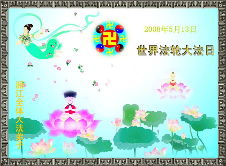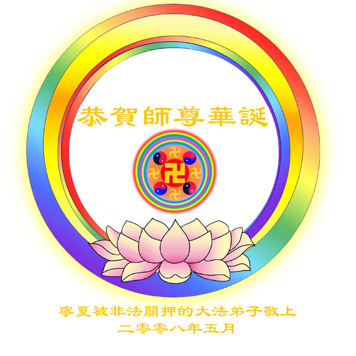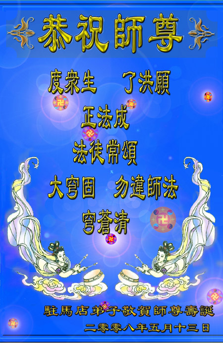 誓约签立苍宇来 洪恩浩荡慈悲怀 ·九·评*除恶天外来 讲清真相慈心怀 堕入凡间土中埋 历尽万劫救子来 劈龙斩兽灭恶灾 救度众生免天灾 千古轮回造业苦 神功消去生生罪 随师正法了洪愿 待到弟子现神日 唯盼归真志尚在 佛法唤醒心雾开 佛手挥闪亿莲开 叩随恩师乘莲台 哈尔滨市大法弟子敬献 二零零八年五月七日 广东清远市全体大法弟子祝愿慈悲伟大的师尊生日快乐! 愿5月13日法轮大法日普天同庆!