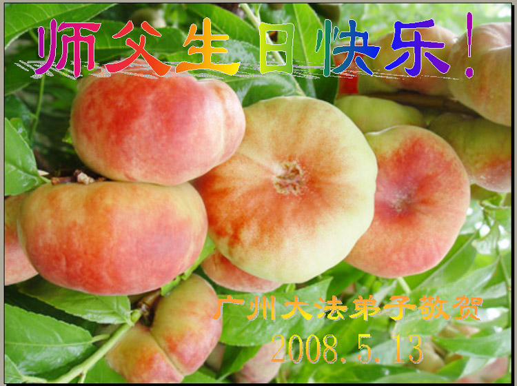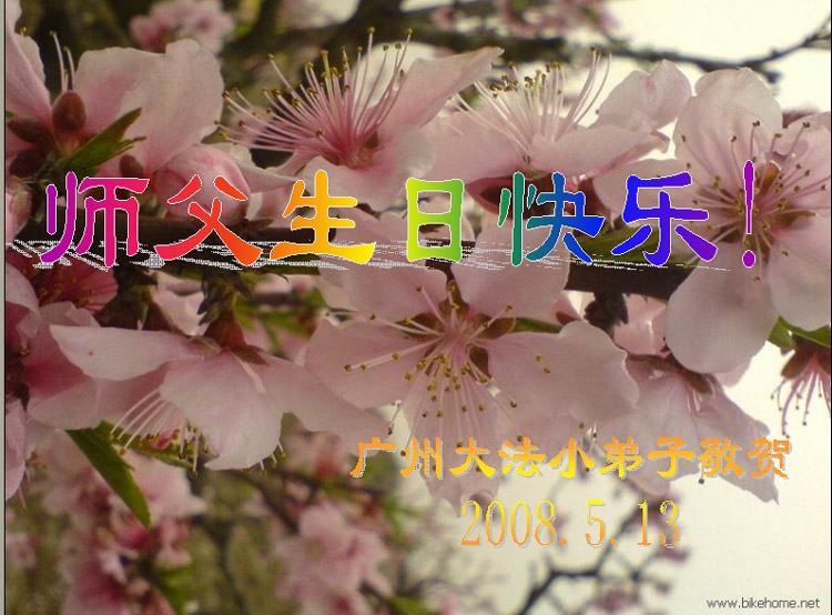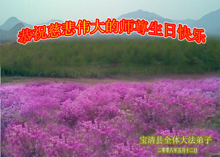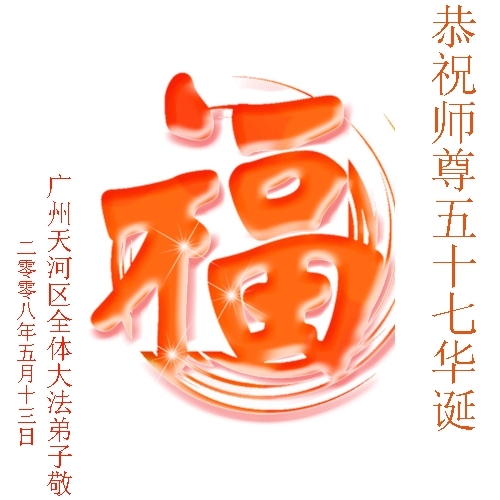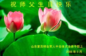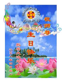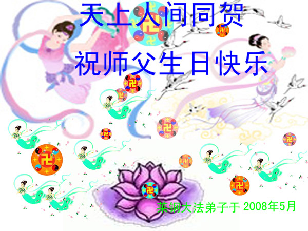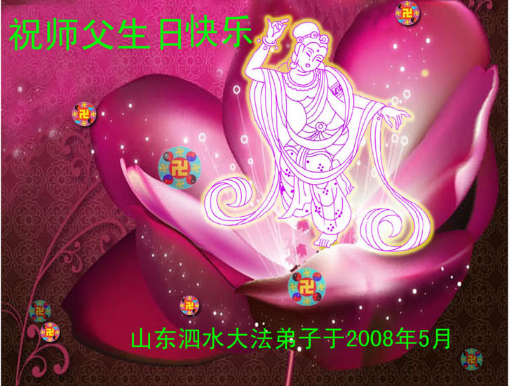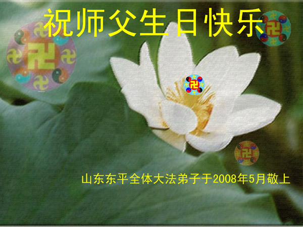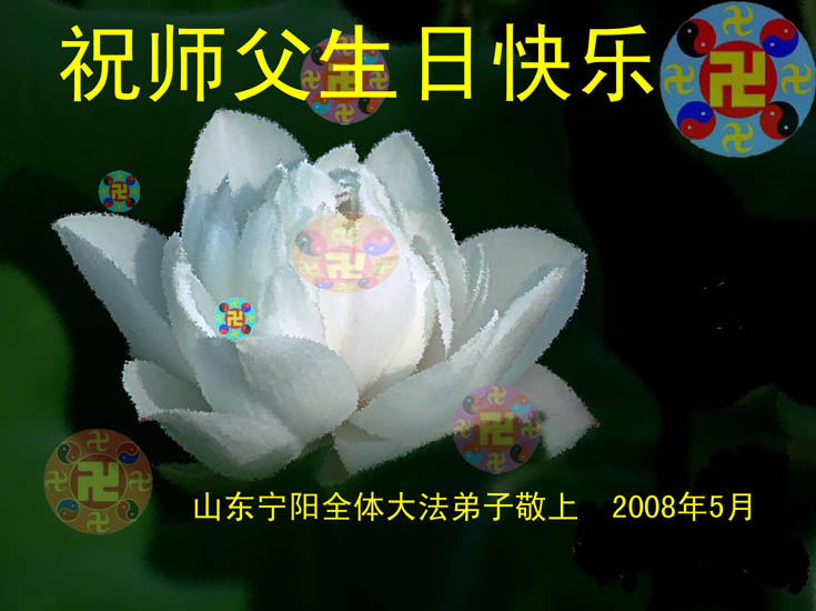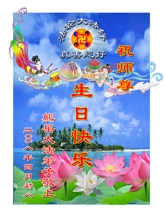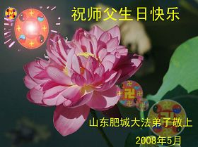 祝师父生日快乐!普天同庆同乐!亿万众生沐浴佛恩;感谢师尊救度众生之洪恩;我们大法弟子努力做好三件事,讲真相救众生、完成史前大愿、走好最后的路,不辜负师父慈悲救度,请师父放心。 山东省兗州市全体大法弟子敬上 2008年5月7日9时 大陆大法弟子敬祝师父生日快乐