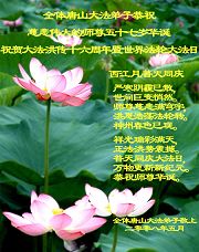 在此法轮大法日来临之际,在此一刻值千金万金之时,大法弟子当一以当十,一以当百做好三件事,不辜负师尊佛恩浩荡救度之恩! 驻马店全体大法弟子 二零零八年五月十三日 兰州大法弟子庆贺大法洪传十六周年,恭祝师尊生日快乐