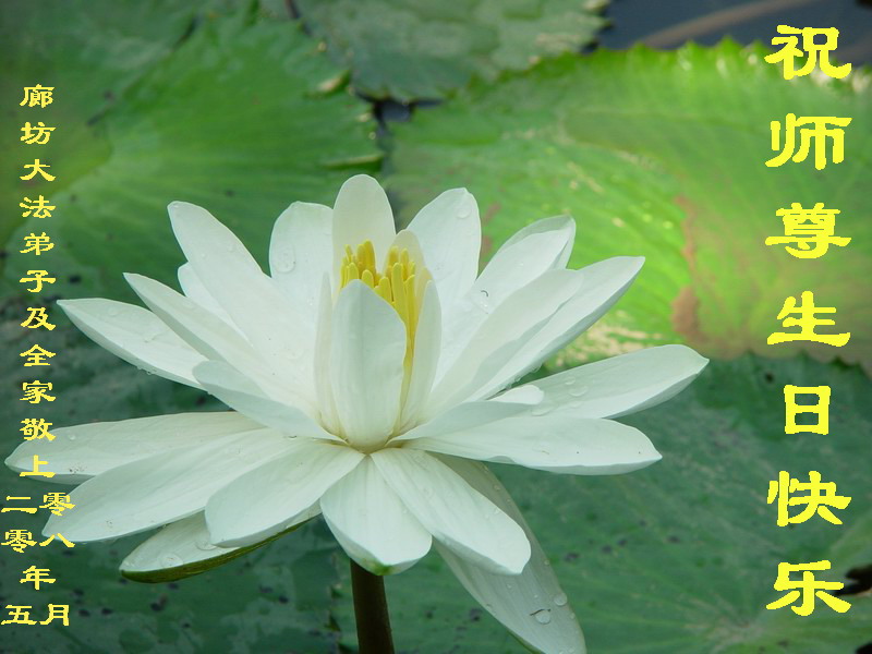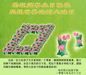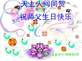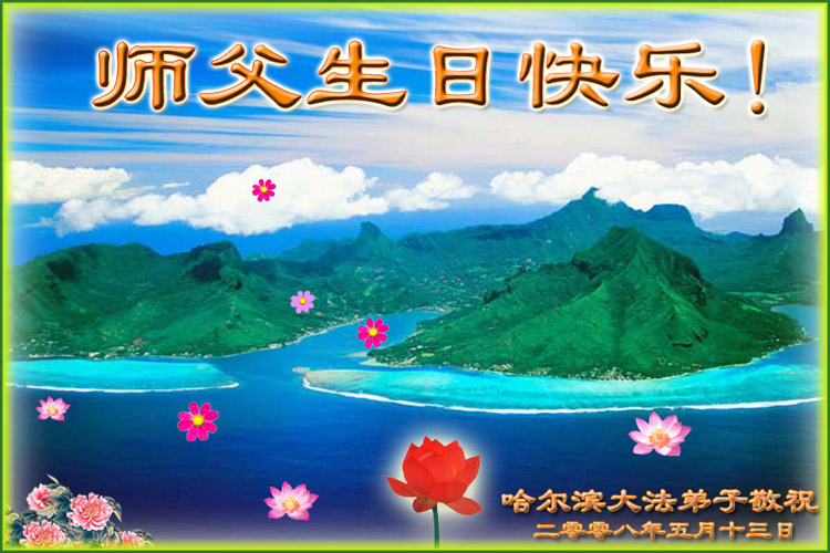 尊敬的师父:我们要用实际行动祝贺您的生日:在正法的最后时刻,抓紧时间做好三件事,正念正行走好最后的路,把该做的做的更好,完成历史的使命! 祝师尊生日快乐! 廊坊大法弟子 二零零八年五月七日 哈尔滨大法弟子祝师父生日快乐!