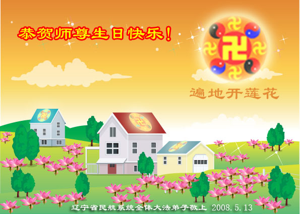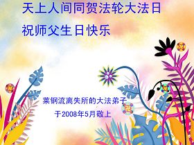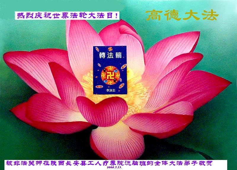 热烈庆祝世界法轮大法日! 被非法关押在陕西长安县工人疗养院洗脑班的全体大法弟子敬贺2008.5.13。 大连市金州区大法弟子恭祝慈悲伟大的师父生日快乐!