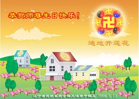师父您好,弟子们想念您!我代表河南焦作大法弟子向您问好,恭祝师父生日快乐! 普天同庆世界法轮大法日。我们一定听师父的话,精進实修,救度众生。认真做好三件事,不辜负师父的慈悲苦度,兑现史前的誓约。 河南省焦作市大法弟子合十敬上 二零零八年五月八日 辽宁熊岳大法弟子恭祝师尊生日快乐!
