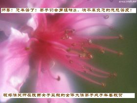 在此,代表全家祝伟大的师尊生日快乐! 代表邯郸所有大法弟子祝师父生日快乐! 在伟大正法时期的最后时刻,我们一定严格要求自己,勇猛精進,做好三件事,抓紧救度众生,不给自己留下遗憾。 二零零八年五月八日 石家庄市大法弟子敬祝师尊生日快乐!