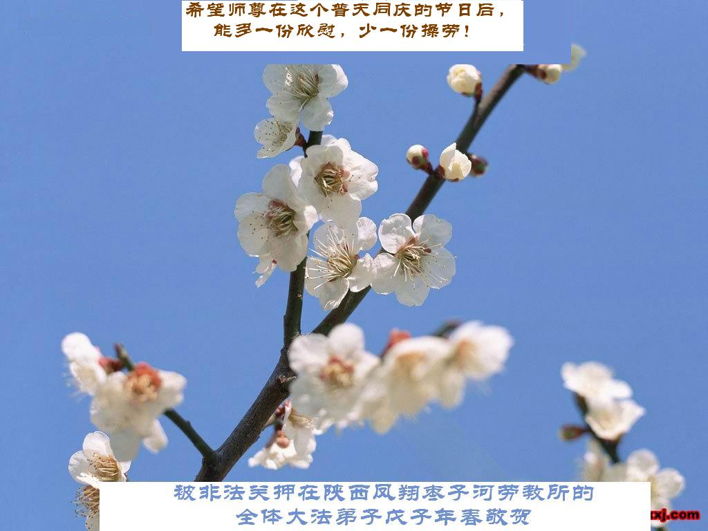 敬祈师尊在这个普天同庆的节日后,能多一份欣慰,少一份操劳! 被非法关押在陕西凤翔枣子河劳教所的全体大法弟子戊子年春敬贺 被非法关押在陕西长安县工人疗养院洗脑班的全体大法弟子恭贺师尊华诞