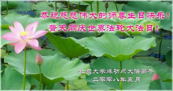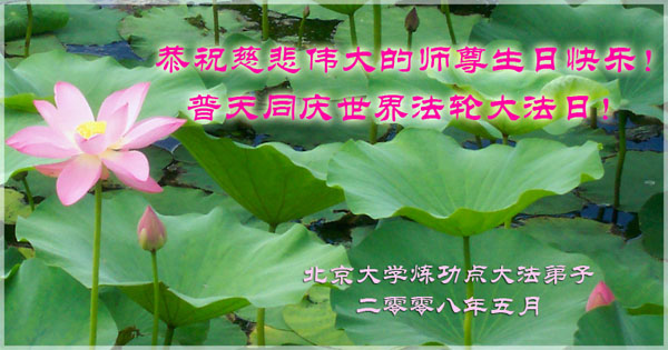 慈悲伟大的师尊您辛苦了!在这普天同庆的时刻,我们吉林农安全体大法弟子恭贺师尊生日快乐!在这正法最后有限的时间里,我们谨遵师尊教诲,勇猛精進,做好三件事,完成史前大愿,圆满随师还。 弟子们再一次向师尊叩拜! 二零零八年五月十日 北京大学大法弟子祝师尊生日快乐!