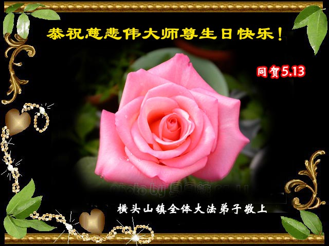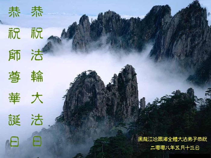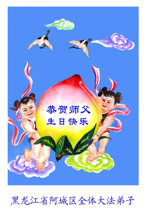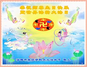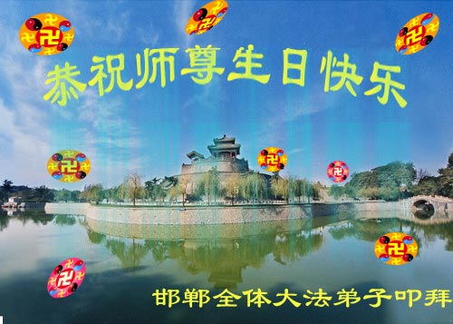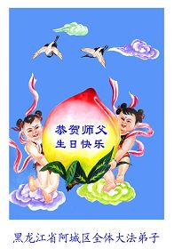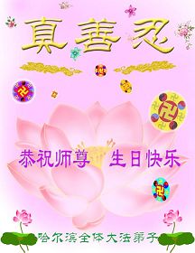 回顾我们的修炼历程,有做好时的欣慰,有做不好时的痛心,特别是在邪恶的环境下,我们大法弟子本着对师父,对大法的坚定信念走到了今天,其中的艰辛是常人无法理解的,这就是大法弟子,正法时期的大法弟子,助师正法的大法弟子,走在神的路上的大法弟子,看到世人的觉醒,更增加了我们救度众生的信心,请师尊放心我们会做好三件事,做名副其实的大法弟子,让师尊多一份欣慰,少一分操劳,再一次恭祝师尊生日快乐! 砀山县全体大法弟子及觉醒世人 2008-4-28 哈尔滨市大法弟子祝师尊生日快乐!