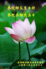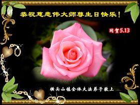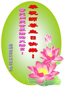 值此慈悲伟大的师尊华诞和“世界法轮大法日” 及法轮大法洪传于世十六周年纪念日即将来临之际,汕头地区大法弟子和被非法关押法轮功学员恭祝师尊生日快乐!我们定要努力做好三件事,救度众生,兑现誓愿,精進再精進! 开封市一农村学法组全体弟子恭祝师尊生日快乐