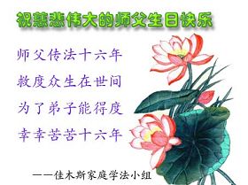 祝贺法轮大法洪传世界十六周年﹗ 师父救度弟子的付出与艰辛,弟子无以言表,唯有做好三件事,走好走正师父指引的正法之路,救度更多有缘人。 佳木斯制药系统大法弟子敬上 合十 日照大法弟子祝伟大慈悲的师父生日快乐!