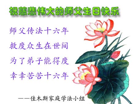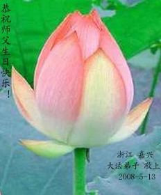 斗转星移十六载 大穹从组新宇来 天地归正苍生福 泥沙淘尽真金在 环球弟子庆圣诞 恩师笑看金莲开 二零零八年五月八日 四川省新津县全体大法弟子祝慈悲伟大的师尊生日快乐!
