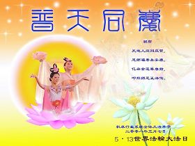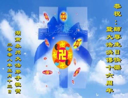 大法洪传十六年, 普天同庆“五。一三”; 恭祝师尊华诞日, 众生叩拜主佛缘。 佛恩浩荡正蒼穹, 慈悲苦度救众生; 待到三界同化日, 天上人间庆升平。 2008.5.7 天津市大法弟子恭祝慈悲伟大的师父生日快乐!庆祝法轮大法洪传十六周年!