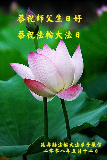 尊敬的师尊您好!师尊辛苦了! 在师尊生日暨五月十三日世界法轮大法日即将来临之际,我最衷心的祝贺师尊生日快乐! 我非常想念师父,非常感谢师父慈悲救度。我一定努力做好三件事,救更多的众生,不辜负师父对我的期望和慈悲苦度。 杨爱华 二零零八年五月五日 荣成市家庭大法弟子恭祝慈悲伟大的师尊生日快乐!