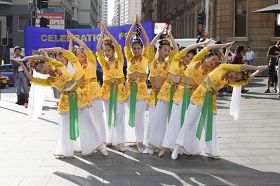 | 【明慧网二零零八年五月十三日】(明慧记者华清、蕴韵悉尼报道)二零零八年五月十日,近千名法轮功学员在澳洲悉尼市中心举行了“世界法轮大法日”庆典,其中包括游行、文艺表演和“真善忍画展”等一系列庆祝活动。 * 丰富多彩的文艺演出 游行结束之后,法轮功学员在中国城举行了集会和文艺表演,约翰•戴乐(John Deller)先生代表纽省法轮大法佛学会在集会上发言,他表示,“法轮大法是性命双修的功法,不但教人动作,修炼者更以宇宙 ‘真、善、忍’特性指导他们每天的生活,也起到了维护社会道德的作用。前中共头子江泽民利用手中的权力,对法轮功学员进行了全面的镇压迫害。九年中已有至少三千一百三十七名法轮功学员被迫害致死。中共使用了最邪恶的手段——活体摘取法轮功学员器官牟取暴利。这是人类的巨大灾难。通过今天的活动我希望大家能进一步了解法轮大法的美好,去呼吁和帮助制止在中国对法轮功的迫害。” 随后法轮功学员的功法演示以及舞蹈、合唱、舞狮等丰富多彩的文艺表演吸引了众多华人和澳洲民众驻足观看,并纷纷接过法轮功资料了解真相,也有很多善良民众当场在请愿信上签名声援法轮功。中国城的文艺表演最后在“法轮大法好”的大合唱和天国乐团的演奏中顺利结束。  法轮功学员表演舞蹈庆祝“世界法轮大法日” |