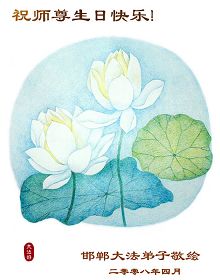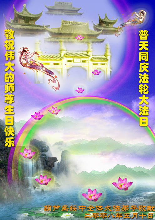 对师尊的佛恩无以为报,仅此片语略表寸心。只有继续精進努力做好三件事,直到满载众生圆满随师还。 二零零八年五月十 日 抚顺大法弟子祝师尊生日快乐!