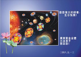 我们一定走师父安排的修炼道路,跟师父回家。 临朐县大法弟子恭祝慈悲伟大的师尊生日快乐!普天同庆2008年“世界法轮大法日”!