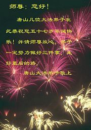 师尊您好:我代表全家三口向慈悲伟大的师尊问好,师尊您辛苦了。谢谢师尊的慈悲苦度。我用尽人类的语言也无法表达出对您的感恩。请师尊放心,我们一定走好师尊安排的路,做好三件事,救度更多的众生,全力的讲清真相,兑现自己的誓约。 二零零八年五月十日 四川成都的大法弟子恭祝师父生日快乐!