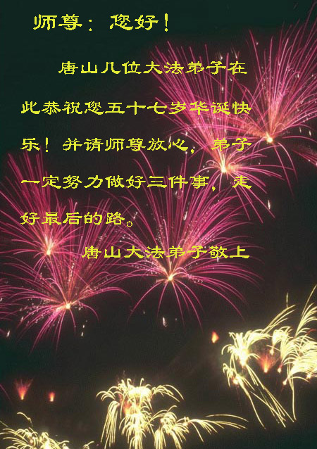 佳节又至,西安大法弟子恭贺师尊华诞。在这普天同庆之际,向师尊道一声问候。 弟子们一定按照师尊的要求,证实大法,救度众生,走好最后的一段路。 西安大法弟子敬上 二零零八年五月十一日 唐山大法弟子祝师尊生日快乐