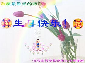 敬爱的师尊:祝您生日快乐!您辛苦了! 河北省灵寿县全体大法弟子想念您!大陆的全体大法弟子想念您!宇宙众生想念您! 能做您的弟子是我们无上的荣耀,我们一定听您的话,尽力做好“三件事”,不使您失望,不使宇宙众生失望! 大陆的全体大法弟子迫切盼望着早日在大陆拜见您、听您讲法! 河北省灵寿县全体大法弟子拜上 2008-5-11 (附:我制作的这个生日贺卡,在制作时并没有彩虹,但在保存后出现了两道美丽的彩虹!——而且我也根本也不会制作彩虹!——这两道彩虹使贺卡显得進一步完美,超出了想象。我相信这一定是师尊的鼓励!) 衡水全体大法弟子祝伟大的师尊生日快乐