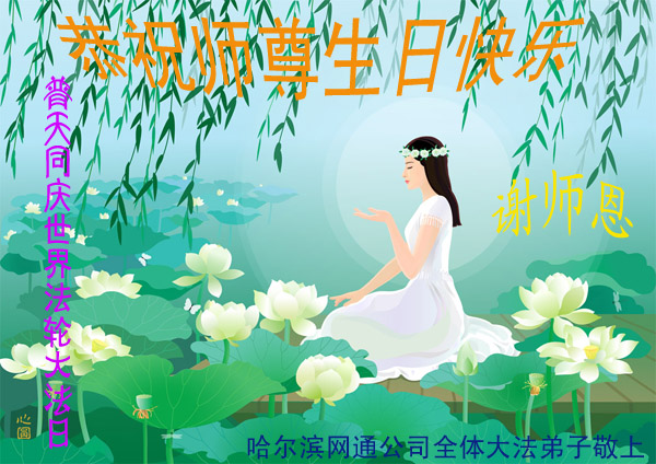 师父您好!师父您辛苦了!我们非常想念您!我们无法用语言表达师父对我们的救度之恩,我们只有按照师父的要求做好“三件事”,正念正行,完成历史赋予我们的使命,才能不辜负师父对我们的慈悲苦度。 哈尔滨网通全体大法弟子恭祝师尊生日快乐!庆祝世界法轮大法日!