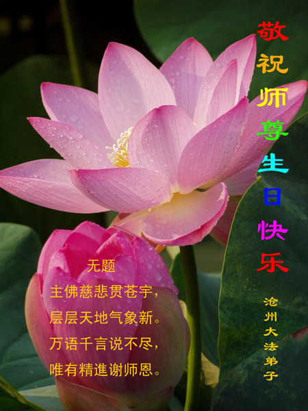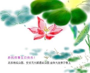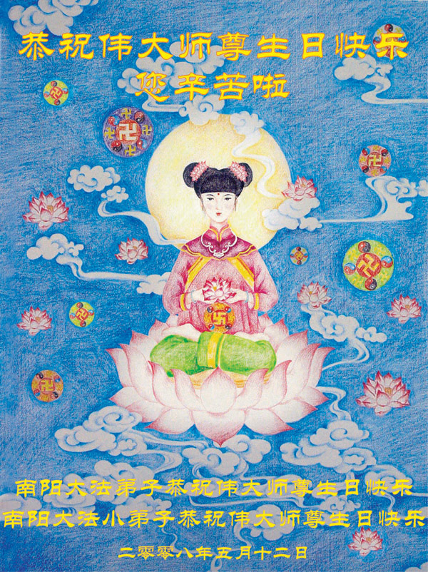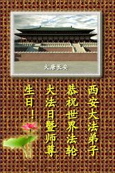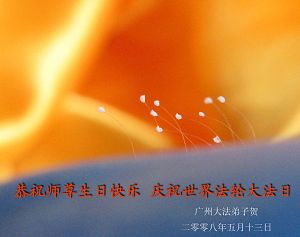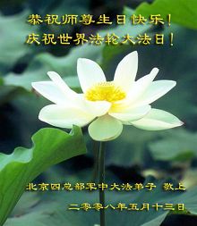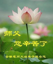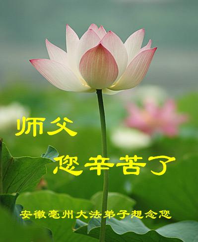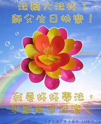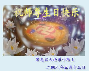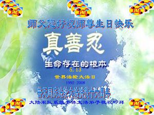 感谢师尊的慈悲救度,请师父放心弟子一定会做好三件事,以法为师,刻苦修炼,早日圆满,随师回家。 二零零八年五月十三日于北京 安徽亳州大法弟子祝师父生日快乐!
