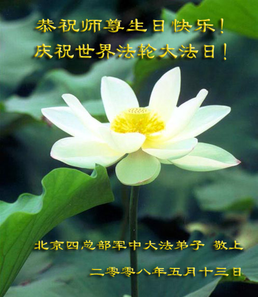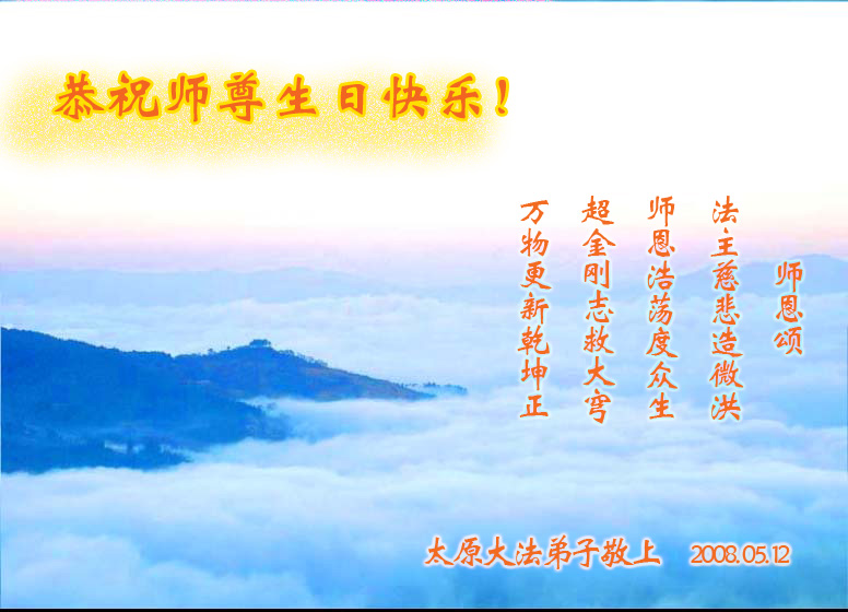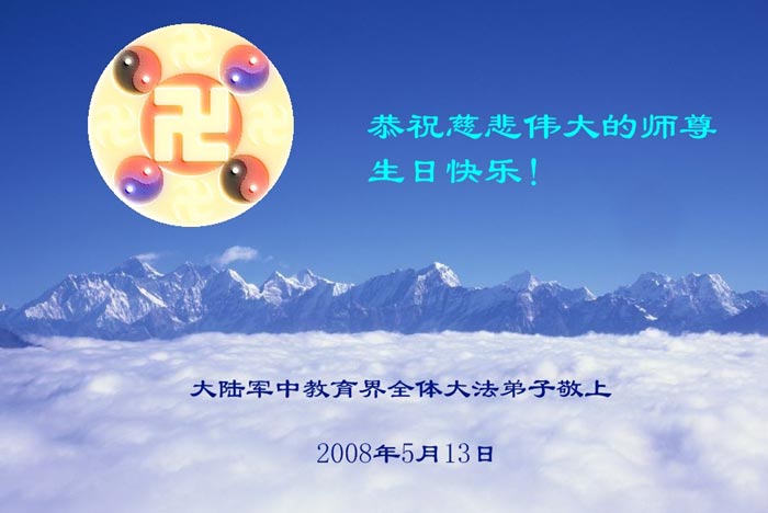 在师父生日5月13日到来之际,向慈悲伟大的师尊问好,我们一定努力做好三件事,救度众生,完成史前洪愿、兑现我们的誓约。 河北邢台大法弟子 2008年 大陆军中教育界全体大法弟子恭祝慈悲伟大的师尊生日快乐!