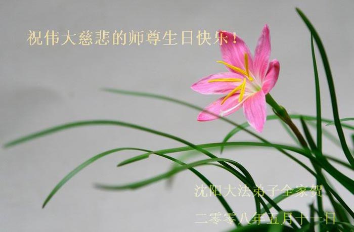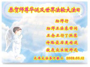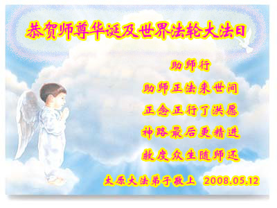 助师正法到今天,我们更明白了自己的使命。我们一定不辜负师父的慈悲苦度,做好三件事,实实在在的修好自己,圆满随师还。 河南漯河市一资料点大法弟子 二零零八年五月十二日 云南全体大法弟子恭祝师尊生日好
