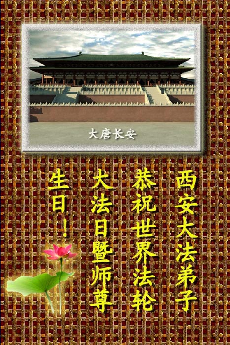 慈悲伟大的师尊您好: 感谢师尊对我十一年的慈悲苦度,在这普天同庆的大好日子里,弟子真诚的问候师尊:师尊您好!师尊您辛苦了!弟子一定努力做好“三件事”等候师尊早日归来! 陕西省在外打工的大法弟子恭祝慈悲伟大的师尊生日快乐!