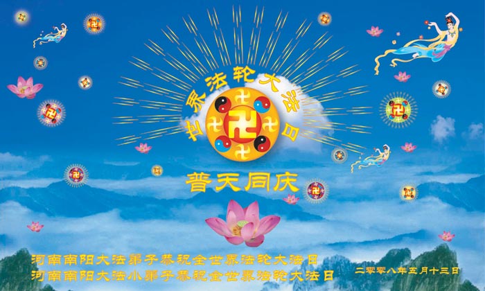 河南省南阳市大法弟子恭祝师尊五十七华诞暨大法洪传十六周年!热烈庆祝世界法轮大法日!