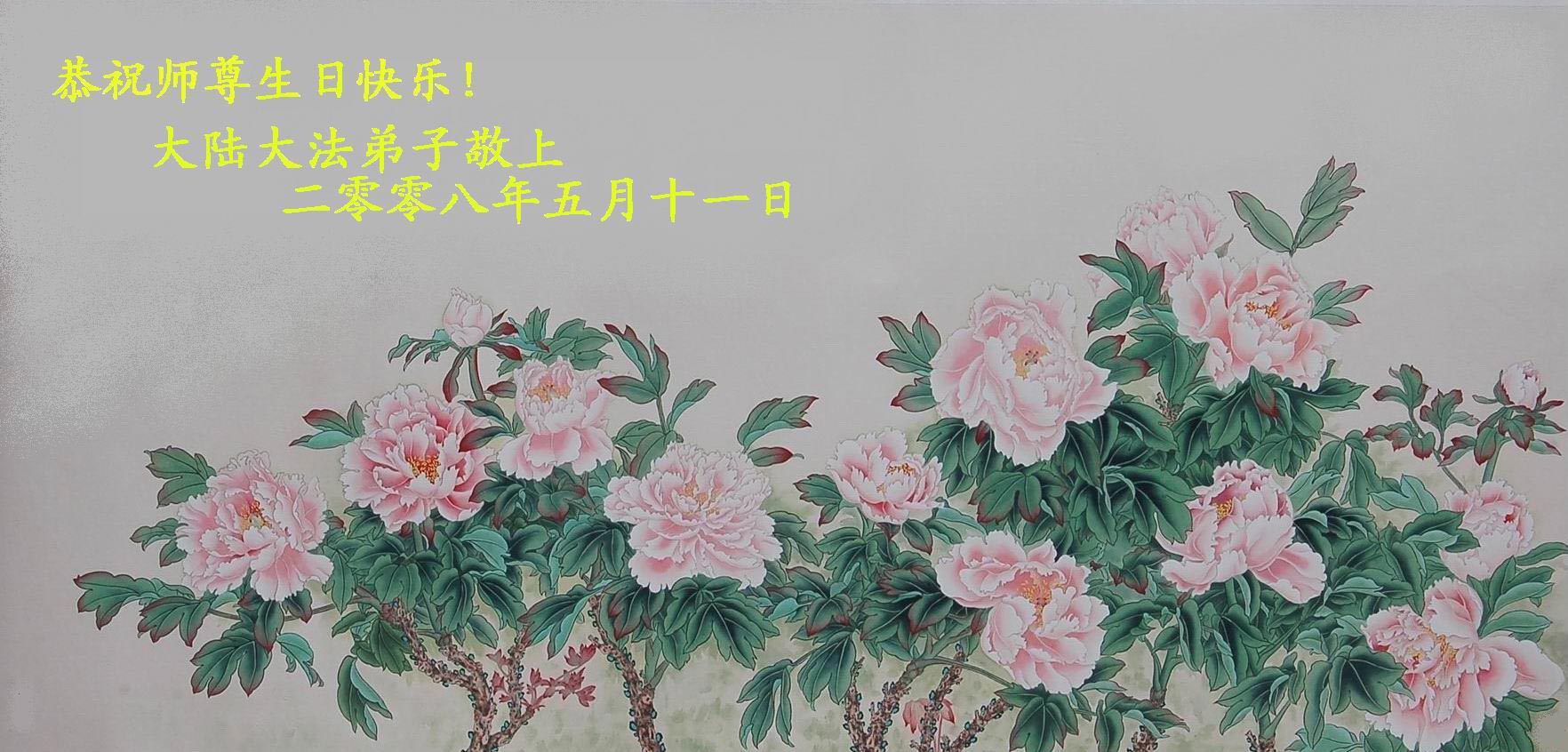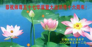 我们一定不负自己的洪誓大愿,努力做好三件事,让师尊放心。 二零零八年五月十二日 湖南省衡阳市在浙江省工作的大法弟子恭贺师尊生日快乐!