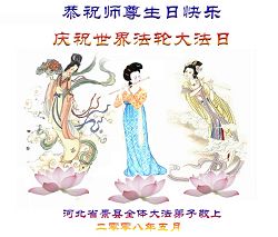 在师尊五十七华诞暨第九届世界法轮大法日来临之际,河北省全体大法弟子恭祝师尊生日快乐! 在助师正法的最后时期,我们无论在任何情况下都一定坚定正念,更加清醒、更加理智的走好正法之路,学法修心,广传真相,正念除恶,修好自己,努力做好三件事,决不辜负师尊的慈悲苦度和众生的殷切期盼,不负正法时期大法弟子证实法和救度众生的伟大使命!让师尊能多一份欣慰,少一份操劳!师尊,您辛苦了!请师尊放心! 河北省全体大法弟子跪拜合十 二零零八年五月十一日 大法弟子全家恭祝慈悲伟大的师尊生日快乐!