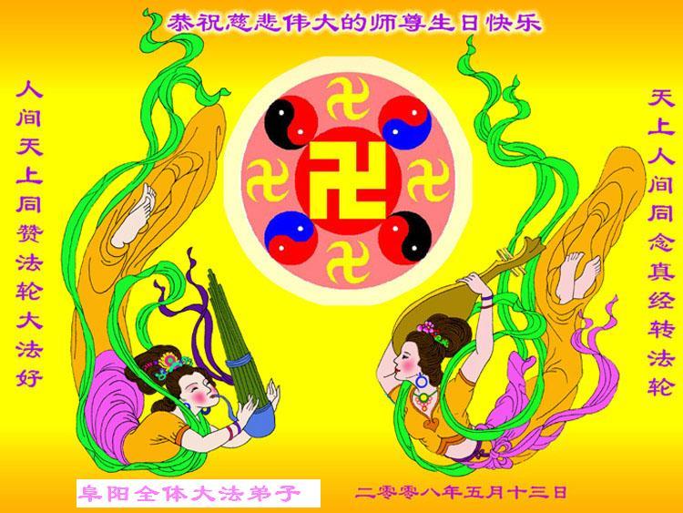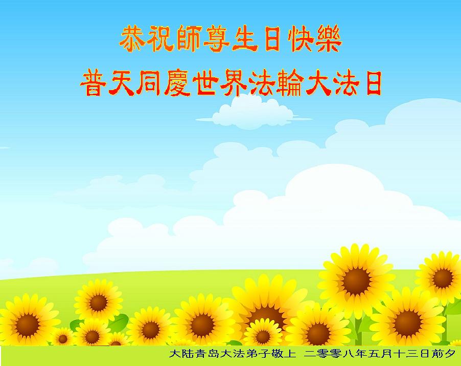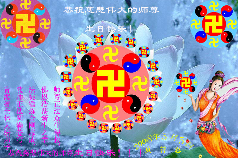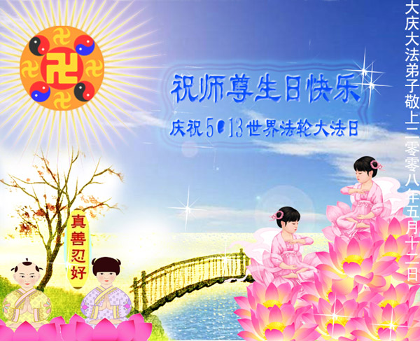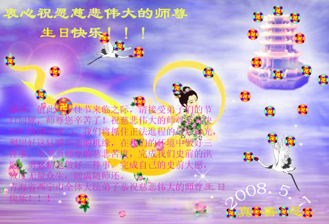 | 【明慧网二零零八年五月十四日】 沧州大法弟子祝师父生日快乐! 黑河大法弟子恭祝慈悲伟大的师尊生日快乐! 涿州市大法弟子一家人祝:师父生日快乐! 河南漯河市一资料点大法弟子恭祝师父生日快乐! 万事如意! 云南全体大法弟子恭祝师尊生日好 湖南省攸县大法弟子祝师尊生日快乐! 辽源市大法弟子及小弟子敬贺师尊五十七华诞及大法传世十六周年 江苏太仓大法弟子祝师父生日快乐 东营大法弟子恭祝师尊生日快乐!普天同庆世界法轮大法日! 敖汉全体大法弟子祝师尊生日快乐! 江苏省全体大法弟子遥祝师尊生日快乐,万事如意! 贵州全体修文县大法弟子恭祝师尊生日快乐! 湖南省衡阳市在浙江省工作的大法弟子恭贺师尊生日快乐! 青岛大法弟子恭祝师尊生日快乐暨普天同庆世界法轮大法日 中国大陆军队内全体大法弟子恭祝师父生日快乐 安徽亳州大法弟子祝师父生日快乐! 杭州大法弟子恭祝慈悲伟大的师尊生日快乐! 长春市全体大法弟子恭祝慈悲伟大的师尊生日快乐!普天同庆同颂世界法轮大法日! 广州大法弟子恭祝师尊生日快乐暨庆祝世界法轮大法日 吉林市教育界大法弟子恭贺师尊生日快乐! 大连大法弟子恭祝师尊华诞、同庆世界法轮大法日! 青海省全体大法弟子恭祝慈悲伟大的师尊生日快乐 青海省西宁市全体大法弟子恭祝慈悲伟大的师尊生日快乐 岳阳大法弟子祝师尊生日快乐 天津宁河县全体大法弟子向师尊问好!祝师尊生日快乐! 全国公安系统的全体大法弟子恭祝师尊生日快乐! 抚顺市新宾县全体大法弟子恭祝师尊生日快乐! 辽宁省东港市大法弟子恭祝师尊华诞 河南省南阳市大法弟子恭祝师尊五十七华诞暨大法洪传十六周年!热烈庆祝世界法轮大法日! 北京大法弟子恭祝师尊生日快乐 九江全体大法弟子恭祝慈悲伟大的师尊华诞快乐! 河北省廊坊市学员感谢师尊救度! 湖南省衡阳市大法弟子祝师尊生日快乐 杭州大法弟子恭祝师尊生日快乐 陕西省在外打工的大法弟子恭祝慈悲伟大的师尊生日快乐! 胜利油田大法弟子祝师父生日快乐 铁岭大法弟子恭祝慈悲伟大的师尊生日快乐! 上海大法弟子祝慈悲伟大的师尊生日快乐 湖北咸宁弟子庆贺法轮大法日、恭祝师父生日快乐! 大庆大法弟子恭祝伟大的师父生日快乐!同庆法轮大法洪传十六载! 湖北省黄梅县大法弟子恭祝慈悲伟大的师尊生日快乐 阜阳全体大法弟子恭祝师父生日快乐! 北京四总部军中大法弟子恭祝师尊生日快乐!普天同庆世界法轮大法日! 北京房山、燕山大法弟子向师尊问好,恭贺师尊生日快乐! 太原大法弟子恭祝师尊生日快乐! 太原大法弟子恭贺师尊华诞及世界法轮大法日 大庆大法弟子祝师生日快乐 苏家屯大法弟子祝师父生日快乐 内蒙古通辽大法弟子祝师尊生日快乐 山东省日照市全体大法弟子恭祝慈悲伟大的师尊生日快乐! 江西赣南全体大法弟子恭贺师尊华诞 郑州大法小弟子祝师父生日快乐 黄梅县大法弟子祝师父生日快乐! 上海大法弟子祝师父生日快乐! 深圳全体大法弟子祝师父生日快乐 黑龙江大法弟子祝福师尊生日快乐! 湖南祁阳大法弟子恭贺师父生日快乐、庆祝世界法轮大法日 吉林省通化市全体法轮大法弟子恭祝慈悲伟大的师尊生日快乐!并贺世界法轮大法日! 山东省东营市广饶县全体大法弟子祝师父生日快乐!庆祝五月十三日世界法轮大法日暨法轮大法洪传十六周年! 江西洪都全体大法弟子恭祝师父生日快乐 广东大法弟子祝师尊生日快乐 安徽蚌埠大法弟子恭祝师尊五十七华诞暨大法洪传十六周年! 大陆大法弟子恭祝师父生日快乐! 大陆大法弟子全家敬祝师尊生日快乐!恭贺世界法轮大法日! 七岁大法弟子敬祝师父生日快乐! 河北邢台全体大法弟子恭祝伟大的师尊生日快乐!庆贺法轮大法洪传十六周年! 大陆军中教育界全体大法弟子恭祝慈悲伟大的师尊生日快乐! 唐山开平大法弟子敬贺世界法轮大法日! 辽河油田大法小弟子恭祝师尊生日快乐!祝贺世界法轮大法日! 济南大法弟子恭祝慈悲伟大的师尊华诞! 河北宣化大法弟子祝师父生日快乐! 沈阳大法弟子全家祝伟大慈悲的师父生日快乐! 哈尔滨大法弟子恭祝师尊生日快乐! 哈尔滨工业大学全体大法弟子恭祝师尊生日快乐!敬贺世界法轮大法日! 大庆流离失所大法弟子遥祝师尊生日好!普天同庆世界法轮大法日! 西安大法弟子恭祝世界法轮大法日暨师父生日! 吉林省辽源市全体大法弟子恭祝师尊生日快乐! 吉林省辽源市全家五名大法弟子贺师尊华诞! 广州大法弟子恭祝师尊生日快乐! 北京大法弟子恭祝师尊华诞! 岳阳大法弟子敬祝师尊生日快乐! 成都大法弟子恭祝伟大师尊生日快乐! 邯郸大法弟子恭祝伟大师尊生日快乐! 上海大法弟子恭祝师尊生辰! 湖南郴州大法弟子恭祝师尊生日快乐! 大连大法弟子恭祝师尊华诞暨第九届世界法轮大法日! 湖南湘潭大法弟子恭祝伟大的师尊华诞暨传法十六周年! 石家庄大法弟子祝师父生日快乐! 保定大法小弟子祝师父生日快乐! 阜新全体大法弟子恭祝慈悲伟大的师尊生日快乐! 沈阳大法弟子祝师尊生日快乐! 岳阳大法弟子祝师尊生日快乐! 河南南阳大法弟子恭祝世界法轮大法日! 北京全体大法弟子恭祝师尊生日快乐!热烈庆祝法轮大法洪传世界十六周年! 武汉大法弟子恭祝师尊生日快乐!庆贺第九届世界法轮大法日! 大法弟子敬贺师尊华诞! 大法弟子敬贺师尊华