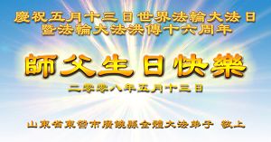 山东省东营市广饶县全体大法弟子祝师父生日快乐!庆祝五月十三日世界法轮大法日暨法轮大法洪传十六周年!