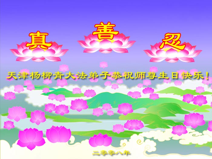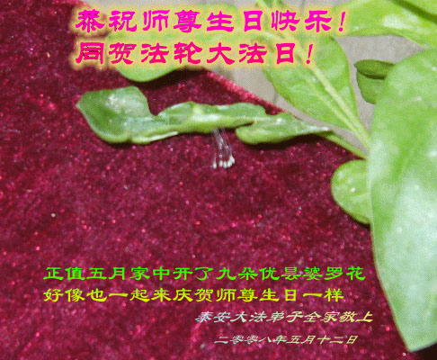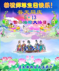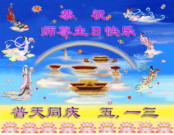 在这普天同庆的日子里,首先祝师尊生日快乐!再说一声:师尊您辛苦了!感谢师尊的慈悲苦度!千言万语也无法表达弟子对师尊的思念! 庆祝法轮大法洪传十六周年!洪传每一个民族!每一个角落!普天同庆!同祝!同贺! 弟子深感自己没有做到“正法时期大法弟子”的标准要求,我下定决心:一定要勇猛精進,一定要多学法!在自己的“心”去修,人心去的越多,才能更好的做好“三件事”!才能配得上“正法时期大法弟子”的伟大称号!才能不辱师命!才能对得起师尊的慈悲苦度! 北京大法弟子叩拜 天津杨柳青大法弟子敬祝师尊生日快乐!