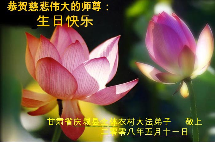 五月十三日世界法轮大法日来临之际,岐山县全体大法弟子祝贺伟大的师尊生日快乐!并祝贺法轮大法传世十六周年!从今往后,我们全体大法弟子更要勇猛精进,认真做好三件事。 岐山县全体大法弟子 2008.5.12 青海大法弟子祝师父生日快乐!