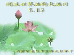 大法洪传十六年, 荡尽污泥建新宇 救度众生万万万 众生得救心喜欢。 热烈庆祝大法传, 大法弟子笑开颜 感谢大法度我们。 精进实修把家还。 大法弟子莲笑 二零零八年五月十三日 诗歌献给世界法轮大法日!