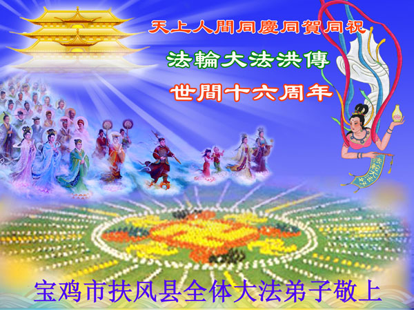 宝鸡扶风县大法弟子祝贺法轮大法洪传十六周年!