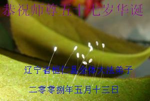 跪拜师尊法像前, 一部天书心记牢, 念师何时返中原。 坚如磐石法铸造。 为了苍生得救度, 越是最后越精进, 忍辱负重家难还。 三月洞天行神道。 庆师五十八华诞, 五月十三喜日到, 想念恩师泪莲莲。 全球恭贺大法好! 弟子遥拜问师好! 佛光普照宇宙新, 家乡盼师迎凯旋。 先他后我树正觉。 二零零八年五月九日 绵阳全体大法弟子)恭祝我们伟大而慈悲的师尊生日快乐!