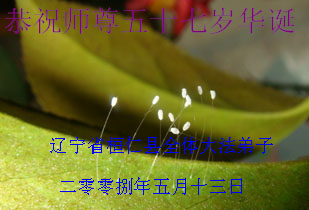 身在尘世中,却是出人间。 谨代表全体深圳大法弟子 同贺师尊五十七岁华诞及法轮大法洪传十六载 辽宁东港市汤池大法弟子恭祝师尊生日快乐!