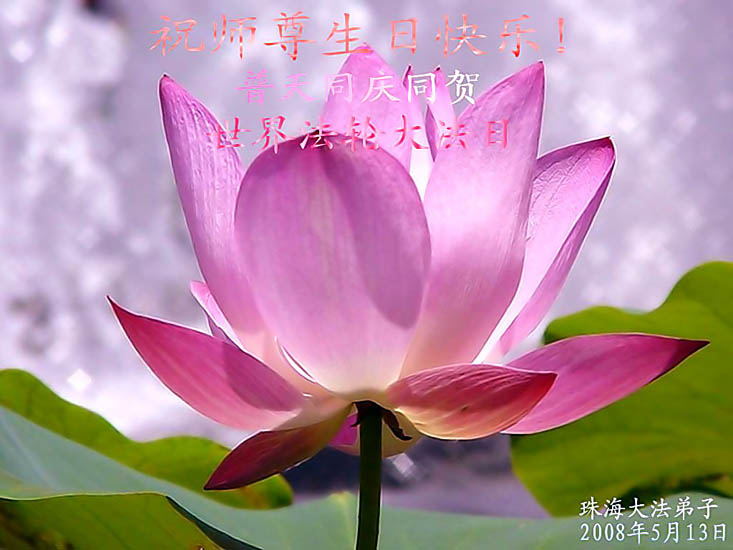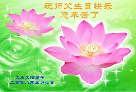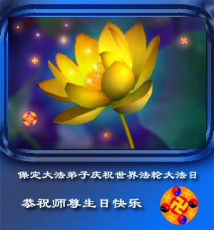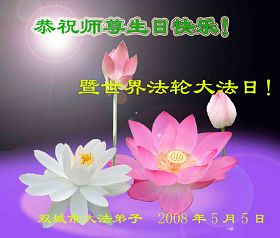 我是一位刚刚从大陆来到美国的大法弟子,不管我在任何环境、任何国家、任何情况下,我都明白自己应该怎样做。大法和师父的需要就是我要做的一切,我要尽我的力救度更多的众生,兑现自己史前的承诺,圆满随师还。 二零零八年五月十二日 佛山大法弟子祝师尊生日快乐