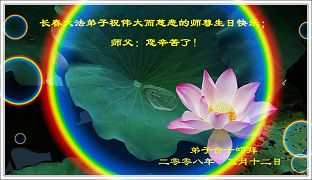 慈悲伟大的师尊啊: 您辛苦了!今借明慧一角,送上江苏淮安弟子迟到的祝愿,祝愿您生日快乐,多一些欣慰,少一些操劳!弟子用这笨拙的语言不知如何表达对您的感恩啊!千言万语,师父啊,您辛苦啦! 江苏盐城全体大法弟子祝师尊生日快乐!