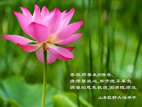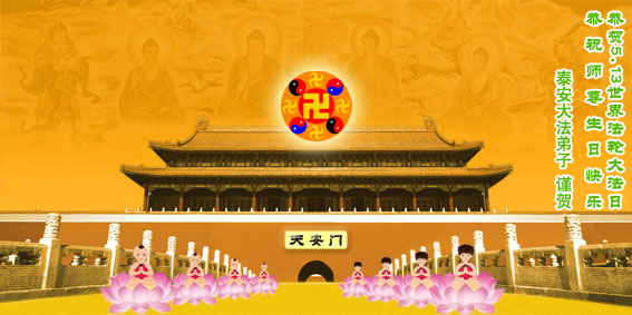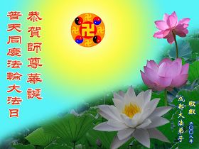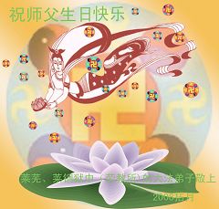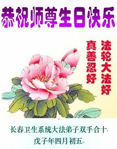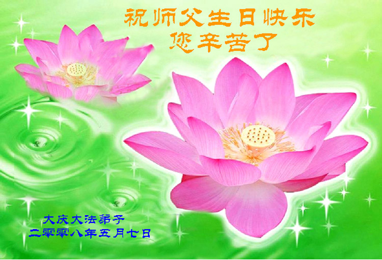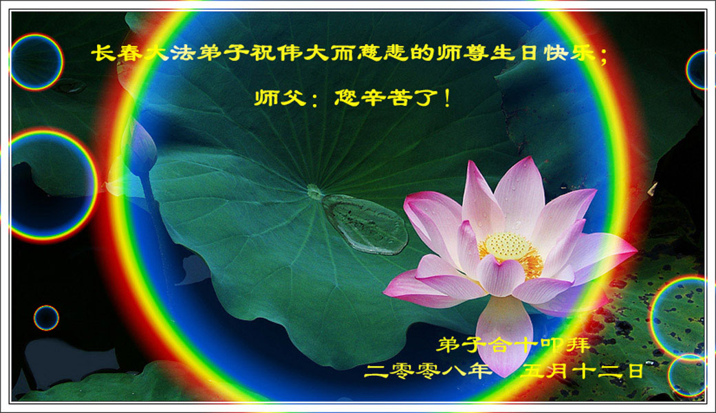 感谢师尊的慈悲救度,请师父放心弟子一定会做好三件事,以法为师,刻苦修炼,早日圆满,随师回家。 二00八年五月十三日于北京 黑龙江省肇东市全体大法弟子恭祝师尊生日快乐。