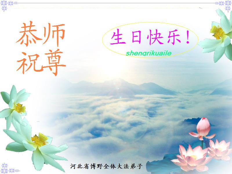 我们要紧紧拉住师尊的手,用正念正行回报您给予的所有;感谢师父的慈悲苦度;坚修大法永随师,功成圆满随师还;修去执着了洪愿。一定要稳健的走好助师正法的每一步。 谢谢师父,您辛苦了,祝师父生日快乐! 唐山市大法弟子敬上。 唐山市大法小弟子祝师父生日快乐! 北京房山区大法弟子祝师尊生日快乐!恭贺世界法轮大法日!