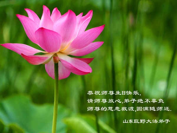 我是大陆的大法弟子,修炼十一年了,未曾见过恩师。 请明慧网代我表达对师父的想念,弟子非常想念师父,请师父放心,弟子一定不辜负师父的慈悲苦度,坚定修炼,一定随师父回家!同时我代表我的家人问师父好。 ----小莲 山东东阿县城及周边的全体大法弟子祝师尊生日快乐