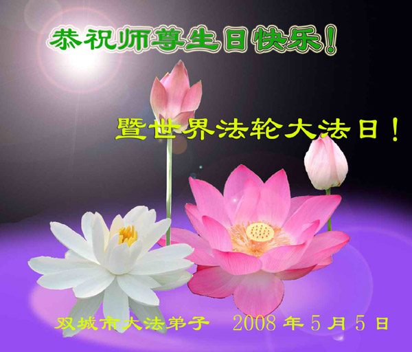 我们一定要时时刻刻牢记师尊的教诲,做好三件事,救度更多的众生,完成大法弟子的历史使命! 锦州太和区大法弟子拜上 二零零八年五月十五日 黑龙江双鸭山矿区大法弟子恭敬慈悲伟大的师尊生日快乐!