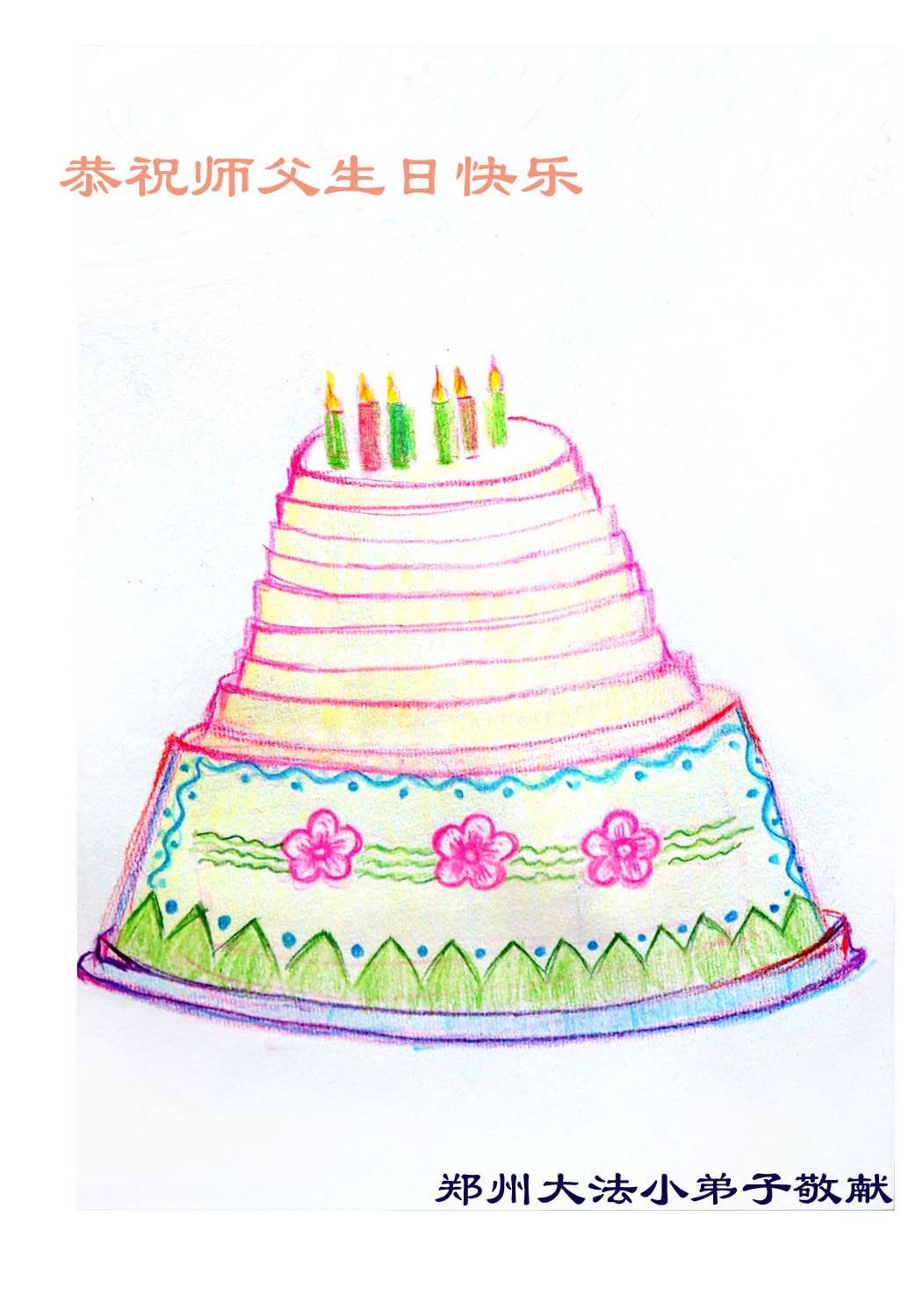 师尊好:七岁大法小弟子在您生日之际在作业本上画了二幅画向您表示生日的祝福,一幅为“祝师父生日快乐!”,一幅为“法轮大法好”!感谢师尊! 在此代表我们全家向师尊致以最诚挚的祝福:师尊生日快乐,师尊辛苦了。 甘肃兰州大法弟子 代表被冀东监狱非法关押迫害的大法弟子祝师尊生日快乐
