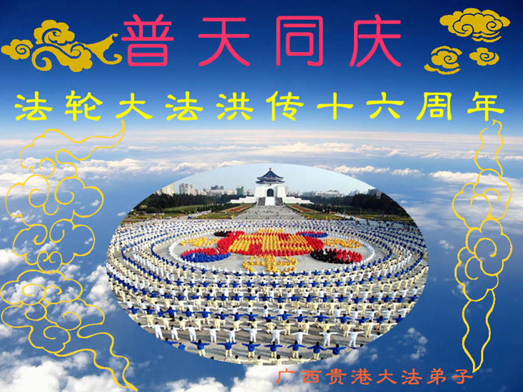 祝贺法轮大法洪传十六周年!祝贺第九届世界法轮大法日!恭祝慈悲伟大的师尊永远快乐!祝全世界大法弟子节日快乐!在此感谢师尊的慈悲苦度! 中国边防部队全体大法弟子 二零零八年五月十三日 广西南宁大法弟子祝师尊生日快乐,祝贺法轮大法日